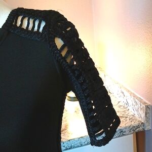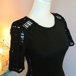 14 1/2" pit to pit. 12" flat waist. 35" length from top of shoulder. stretchy thick woven material. almost compression-like. crochet woven detail on sleeves and down side seams where skin would be exposed. the dress lays straight down from hips (see flat photo). it just looks more flowy there over the half mannequin.