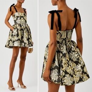 Black and gold Jacquard brocade mini dress, Babydoll fit mini dress, Silver and black brocade cocktail dress, Fleur de lis pattern mini dress, Alice and Olivia brocade party dress, Velvet bow shoulder straps dress, Luxe brocade cocktail gown, Glamorous Jacquard mini dress, Opulent brocade evening gown, Elegant brocade babydoll dress, Luxurious party dress, Alice and Olivia metallic brocade dress, two toned metallic mini dress, Puffy layered skirt mini dress, Tiered skirt party dress, Flared skirt cocktail dress, Layered skirt special occasion gown, Alice and Olivia babydoll dress with voluminous skirt, Self-Portrait, Marchesa, Needle & Thread, Alexis