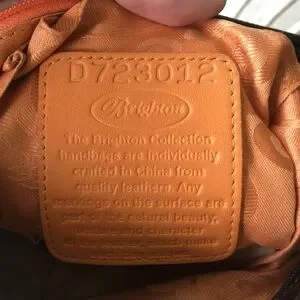 Brighton bag #D723012. One main pocket w/zip top. Many pockets inside. Outer zip pocket with many small pockets inside. Embossed brown patent reptile leather. Orange fabric inside. Silver hardware.