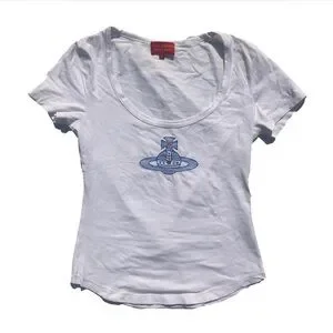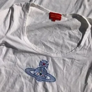 Classic orb logo on a white t shirt with a scoop neck