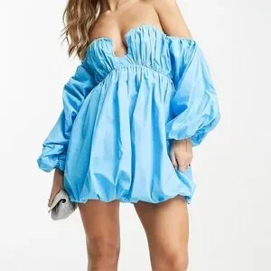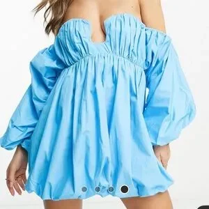 Cotton ruched bandeau mini dress with off shoulder puff sleeve in turquoise