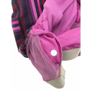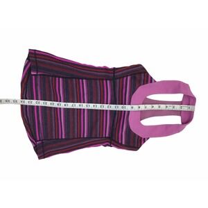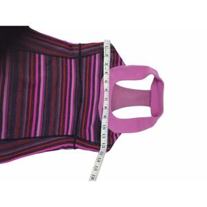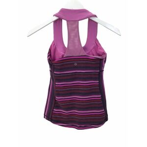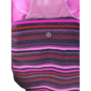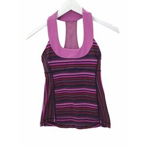 This Lululemon Power Y tank top is a colorful addition to your activewear collection. The multicolored striped pattern features shades of violet, blue, and magenta, with a cross and sports theme. The tank has a scoop neckline and a pullover closure with a strappy sleeve design and racerback strap type. It is made of a polyester blend fabric with stretch features, making it perfect for athletic activities such as yoga, running, and gym training. The tank is pre-owned and fits a women's size 4, with a regular size type and athletic fit.