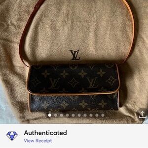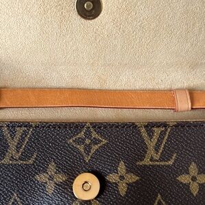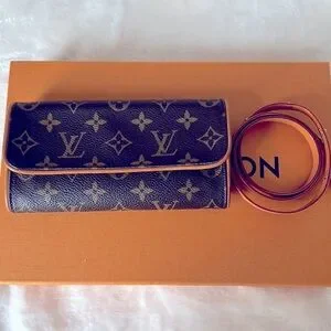 Authentic Louis Vuitton twin pochette PM belt bag. Can be used as clutch or body bag. It has minor stain and dirt inside. Canvas is in good condition and pipings are intact. Belt is adjustable and in excellent condition.