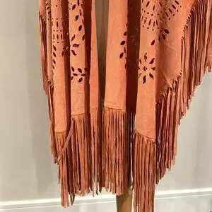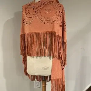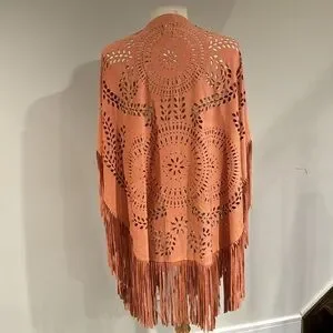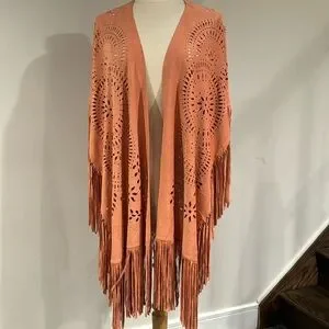 This is absolutely gorgeous and also highly sought after and sold out extremely quickly ! The color description per manufacturer is gingered peach and boy is it dead on Its Faux Suede texture is considered lightweight and lavish. This is a one size fits most kind of garment , so for reference the dress form model is a standard medium ! This is definitely bordering the vintage category so it’s Preloved gently worn and still in excellent shape Condition overall is excellent except it needs a good general handwashing I’m going to leave this option up to the buyer , the new owner and selling as is There are no serious flaws to speak of other than it needing a hand wash there are a few spots here or there as pointed out in photos above . The lil spots will and have come out . Stain lifted very easily with a little elbow grease and whatever clever on your end means laundry soap! Yet get this I’ve got Great news this lovely gem of a beautiful poncho wrap has punched out fabric and with the cutout design it becomes very hard to see and totally blends right in ya can’t see it and neither can anyone else it disappears into pattern, madness, see little spot or stain in figurine photo thank for looking 88% polyester 12% spandex