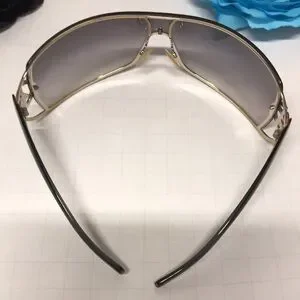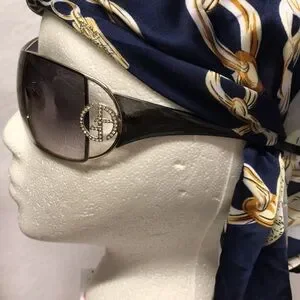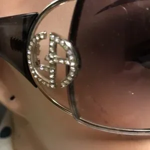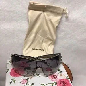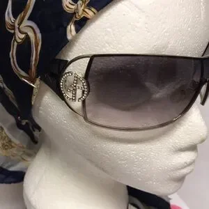 Giorgio Armani Sunglasses are vintage and in excellent condition grey gradient lens with dark see through acrylic arms , stunning beautiful glasses. The GA Logo in gold is adorned with gorgeous clear crystals that sparkle and look classy rich! The case and dust bag is cream , case zips. Vintage. Bought in San Francisco fine high end department store. Well taken care of. Beautiful!