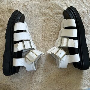 Size 8 women’s chubby sandals. Faux leather material . Black soles with white straps and silver buckles. Adjustable straps. See all photos for condition.