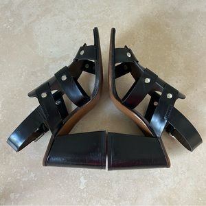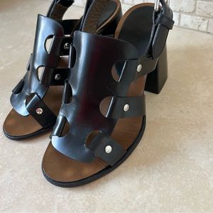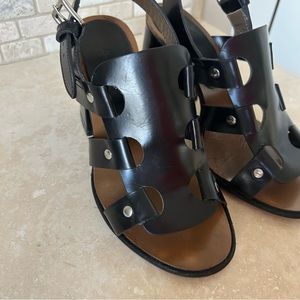 Great pre-owned condition. Some marks/dings/rubs throughout, mainly on the block heels. See all pics! Really not very noticeable as the sandals are black leather! Priced to sell!