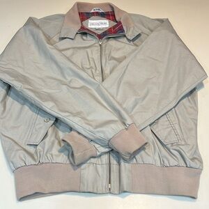Bomber style light grey plaid lined jacket. Banded cuffs and waist, button pockets. Washable