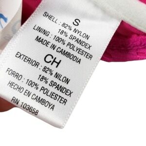 Underwire cups, light removeable padding, adjustable straps, hook and loop back closure, crochet, mesh, lace, netted pattern design over solid bright pink, ruffle at top.