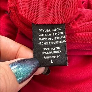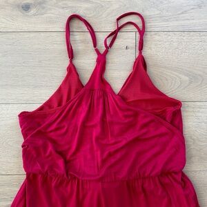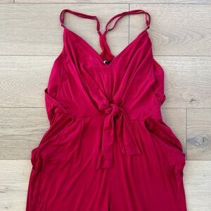 Mid weight jersey jumpsuit in red featuring adjustable straps, drapery layers, decorative tie front, and pockets. Washed once but never worn. Please carefully review each photo before purchase as they are the best descriptors of the item. My price is firm. No trades. First come, first served. Thank you! :)