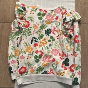 This pretty floral shirt is perfect for spring. Light weight , not heavy. 60/40 cotton poly blend. Cream color with green, yellow and poppy colored floral and greenery. Ruffled shoulder. Excellent condition from smoke free home