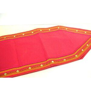 A pretty and colorful 72" pointed cotton table runner. The woven trim is accented with little mirrors.