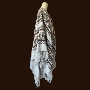 Tan Brown White Alpaca Knit Fringe Large Wrap Oversized Scarf Geometric Ethnic
