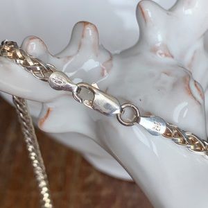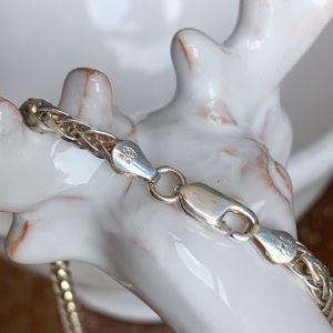 Woven wheat chain in 925 sterling silver with a lobster claw clasp - 18” long x 3m wide.
