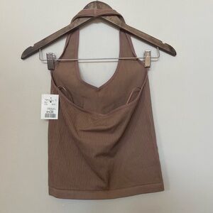 Details: Tan coloured halter top, is a stretchy ribbed material. Slightly cropped.