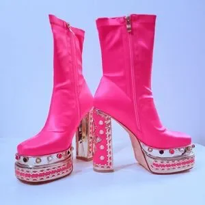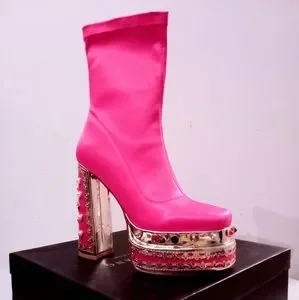 It has it all and more: gemstones embellished platform sole and heels, sleek vibrant nylon texture, glided metallic platform sole, inner zipper, square toe and chunky heels.