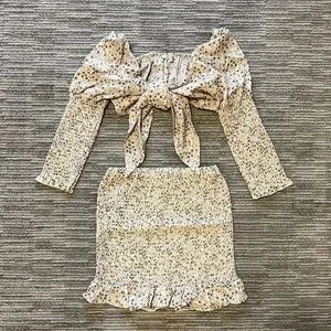 Floral print, stretchy ruffle hem skirt, smocked top and bottom, sweetheart neck, balloon sleeves, tie closure, skirt is 14in long