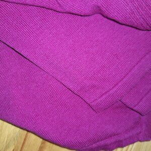 NWOT, purchased almost 20 years ago determined to go from large to medium. Never happened! Beautifully colored fuchsia knit material with ribbed design around neck and down length of each front side. There is a small thread pull on one sleeve (see last pic before tags). See my closet for identical item in teal. Medium weight to keep someone who is always cold warm while looking bright and cheery. Approx measurements: longest length 26", bust 16.5-21.5", waist 18-25.5", hip 19.5-30", sleeve 22.25". Pet friendly home but kept in spare room closet. Wood background is dining table, not the floor.