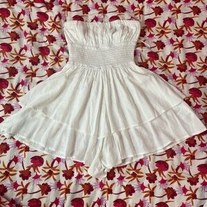 This romper is so cute and flattering. I wish I could wear it. My torso is just a little too long🥲 White Swiss dot fabric forms this strapless ruched bust, smocked waist, and attached tiered ruffle shorts. Pull-on tube design.