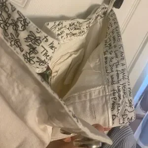 No stains, tears, rips or holes… silver hardware, all buttons still firmly sewn on, not loosened. Has cute Gwen handwriting around inside waist, thin-ish material but not too thin that they’re easy to see thru. They could be considered flare, bell bottom, bootcut, everyone seems to use those terms a little too interchangeably these days lol