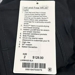 Lululemon Fast & Free 7/8 Tight II Non-Reflective Nulux 25" Black size 2 NWT