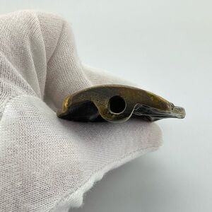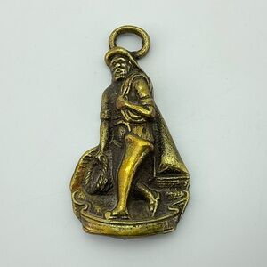 Vintage Brass Fisherman or Sailor Figure. Perhaps a type of Home Decor, Christmas Ornament, or use as a chunky key chain, key fob. The hole on the bottom of the figure has threads inside, so it might be the top of a fireplace tool, or for a bell? There is a rub mark on his hand with orange, or copper showing. It has nice detail; he is holding a basket and some rope. There is a large sail boat in the background. Unique Find. Weird, Wacky Home Decor. Steampunk, Seapunk.