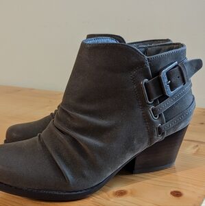 Bare Trap Womens Reid Ankle Booties. Closed round toe. Block 2" Heel. Side Zipper. Heel strap with metal buckle accent. Micro suede top. Size 5M.
