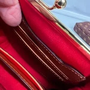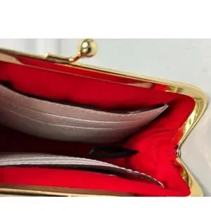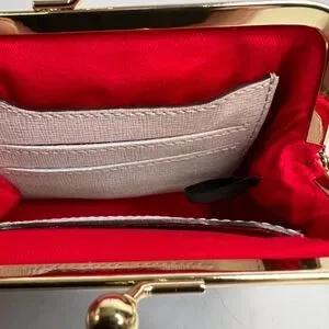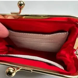 The wallet features a kisslock closure and a framed design. It securely holds coins credit cards, bills and small items. Credit card slots on both sides prove ample storage and organization. Center area is great for tossing in receipts bills and coins.