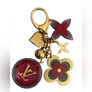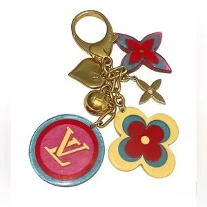 -This is the Authentic LOUIS VUITTON Resin Candy Fleurs Bag Charm in Multicolor. This stunning charm is beautifully crafted in multicolor resin flowers motifs. The bag charm also features the Louis Vuitton signature logos and gold hardware.