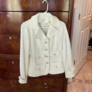 Beautiful cream colored jacket with gold buttons on front, sleeves and back half belt! Fits beautifully! Worn only a few times! Like new!