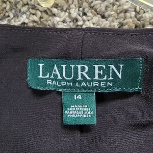 Ralph Lauren Women's Cold Shoulder Jersey A-Line Dress is a knee-length black dress with an A-line style. It has a cold shoulder design and is made of jersey material. The dress is lined and comes in size 14 for regular size type women.