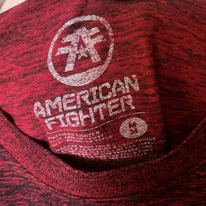 Crimson Red and Textured Black American Fighter T Shirt. Factory distressed crackled print. Red heathered fabric. Mens.