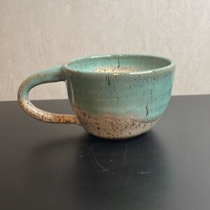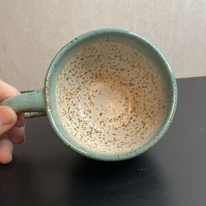 SIGNED Pottery Mug Green Tan Speckled Glaze Beautiful Condition.