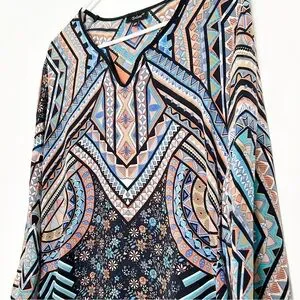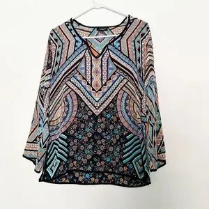 Tags: Johnny was, geometric, colorful, rainbow, multicolor, long sleeve, blouse, flowy, top, tunic, purple, spring, summer, autumn, fall, casual, business, professional, floral, flower, flowers, art, deco, pattern, Paisley, abstract, print, blue, orange, tan, black, navy, aqua, gray, v neck, top, shirt, modal, silk, boho, bohemian
