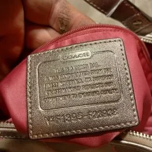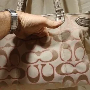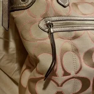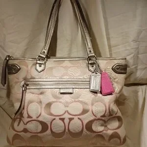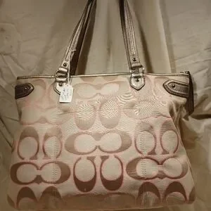 coach signature daisy glam tote, in EUC, large 14x11 in size, zip to close, outside front zip pocket, rear outside pocket, all silver hardware, double hang tags included. notice spot of wear on trim, see pic, luv the pink trim on the c, from a smoke free