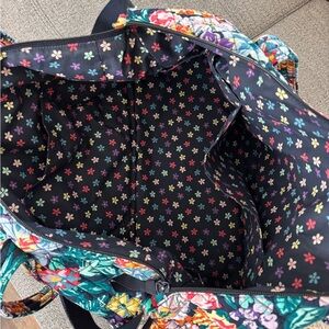 Vera Bradley Midtown travel bag with floral design. The exterior has a slip pocket on one side and a trolly sleeve on the other. The interior has a zip pocket and 2 slip pockets. The bottom has a zippered compartment for shoes, computer, etc. This bag has an identification tag. The double handle is 13”. In addition, there is an unbranded adjustable crossbody strap. Dimensions are 18” L x 14” H x 10” D.