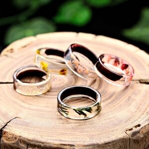 ½ of the ring is made with natural wood to keep you grounded to the earth & the other ½ has dried flowers incased in Acrylic to always have a piece of nature with us!