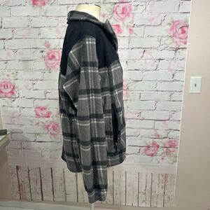 Columbia 2 in 1 fleece plaid detachable inner lining. Black gray print water resistant outer shell with hood jacket. Excellent used condition