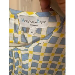 Cratted from 100% cotton. The geometric print pattern is a modern interpretation of the colorful houses of Fontainhas, Goas Portuguese-influenced Latin Quarter. The artwork is hand-screen-printed. Model is wearing a size small.