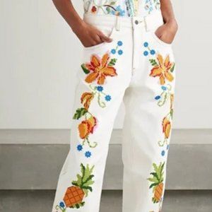 Farm Rio's jeans are beautifully embroidered with pixilated versions of tropical flowers and pineapples. Made from structured denim, they have a high-rise waist and wide legs with frayed hems. Wear yours with a simple tank or one of the label's coordinating tops.
