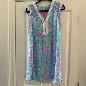 Gently worn 1x, Perfect dress for this hot summer days! So light and flowy! Lilly Pulitzer Joan Tunic Dress Size Small, print is Blue Ibiza Now You Sea Me.
