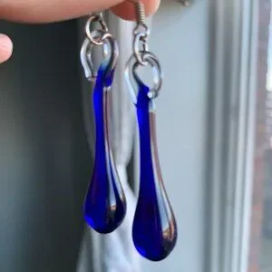 Blown glass, hand-blown, hand blown, Dangle, Teardrop, tear drop, cobalt, blue, clear blue, fashion, dress, Vintage, 90s 80s, color, rainbow, boho, bohemian, hippie, modern, handmade, funky, retro, unique, artisan, artist made, artisanal, hand made, handcrafted, hand crafted, girlie, feminine, coquette, elegant, aesthetic, drop style, pierced, fish hook finding; clear blue, clear cobalt; gift, mothers day, easter, holiday, birthday, jewelry, womens jewelry, girls jewelry, pierced ears, non-pierced, hand painted, flowers, gold, screw-back, screw-on earrings