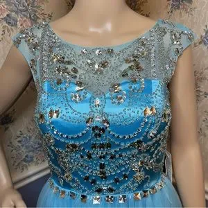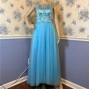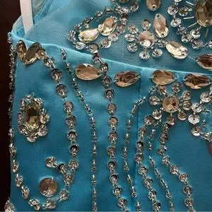 Major Disney Cinderella or Elsa frozen vibes for your next formal event! New with tags however, there is one area near the top of the tulle where there are slight snags. Not noticeable at a distance. Comes with extra rhinestones, just in case. Mesh top with sweetheart neckline. Pretty rhinestones at the top and flowy tulle skirt which has a slight train in the back.