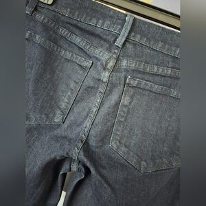 This product is a pre-owned pair of NYDJ jeans for women in size 2 petite. The jeans are made of a dark blue denim fabric with a solid pattern and a dark wash. They feature a straight leg style with a mid-rise and a 5-pocket design. The closure is a combination of a zipper and a button. The jeans also have slimming and stretch features, as well as pockets. The brand is NYDJ and the jeans were made in the United States. The theme of the jeans is a mix of USA, Bohemian, and Preppy.
