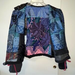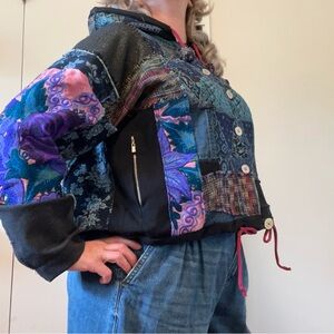 It took a lot of time to put this top together. It has zip pocket and buttoned flap pocket on the sides and two small chest pockets. Draw strings at the bottom hem and the hood with handmade balls.