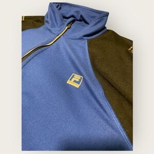 FILA large women’s long sleeve reflective athletic shirt with 3/4 zip. The sleeves and part of the zipper are reflective for night time and safety. Worn a few times. Blue and black.