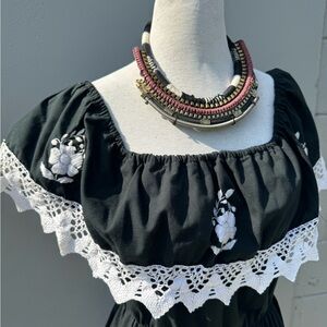Black with white crochet lace and embroidered flowers. Can be worn on or off shoulder. Elasticized waist with full skirt. No fabric tag, presumably cotton or perhaps a blend.