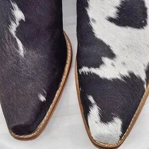 ***Note: Each pair of boots is somewhat unique and may have pattern placement differences on the hides from the photos above, as no two cows have the exact same color pattern. Tooled design is already on the boots and cannot be altered. All boots are black and white hides with brown tooled leather. Boots come wrapped in bubble wrap and in a reusable canvas tote / dust bag and I do not open each pair to look at the pattern. Some boots may have more or less black, depending on the hide used to make the boots. Surprise yourself! Every pair is gorgeous!***