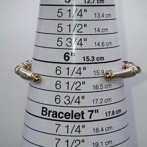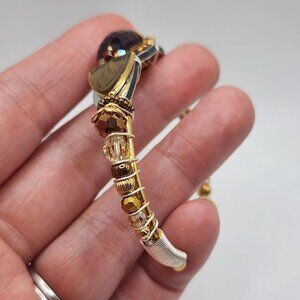 This stunning Liz Tech 2013 cuff bracelet features a captivating central faceted purple glass gemstone, with sable color camphor glass on either side and surrounded by a mix of earth tone beads. The bracelet's design is unique and eye-catching, making it a great addition to any jewelry collection. 6.25" slightly adjustable size. Measurements shown in photos. This beauty is in excellent pre-owned condition. Please feel free to ask questions.