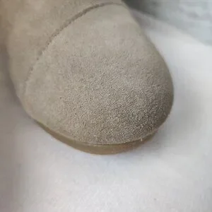 Suede has a couple minor dirt spots on toe and side of boots. There is darker staining at the base of the heel wedge. Please reference photos.